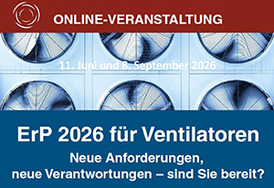![]() | Online-Veranstaltungen zur Ökodesign-Verordnung Ludwigsburg, 15.04.2026 – Der Fachverband Gebäude-Klima e. V. (FGK) veranstaltet Online-Seminare über aktuelle Anforderungen, die mit der Europäischen Verordnung (EU) 2024/1834 für Ventilatoren verb... weiterlesen |